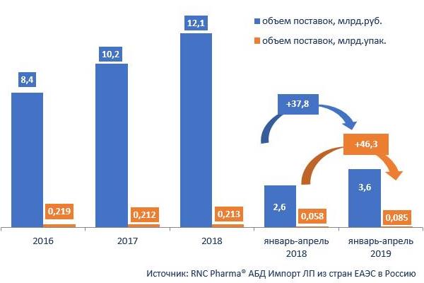 По итогам периода январь-апрель 2019 г. суммарный объём поставок ЛП, произведённых на территории ЕАЭС, в Россию превысил сумму 3,6 млрд руб. (в оптовых ценах, включая НДС), по сравнению с аналогичным периодом 2018 г. динамика при расчёте в российской валюте составила 37,8%. Показатель прироста в натуральном выражении (в упаковках) заметно превышал рублёвую динамику (46,3%), всего с начала 2019 г. в нашу страну было ввезено 85,4 млн упаковок ЛП, произведённых на территории стран ЕАЭС, сообщает аналитическая компания RNC Pharma.