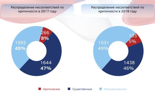По данным инспектората ФБУ «ГИЛС и НП» в 2018 году было выявлено 3 503 несоответствия, из которых 135 (5%) были классифицированы как критические, 1 438 — (46%) как существенные и 1 531 (49%) — как несущественные.